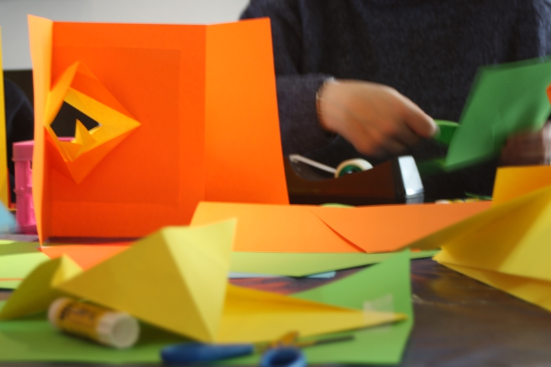 Partager mon savoir-faire en reproduction des systèmes pop-up découverts dans les livres avec le public lors d’ateliers.